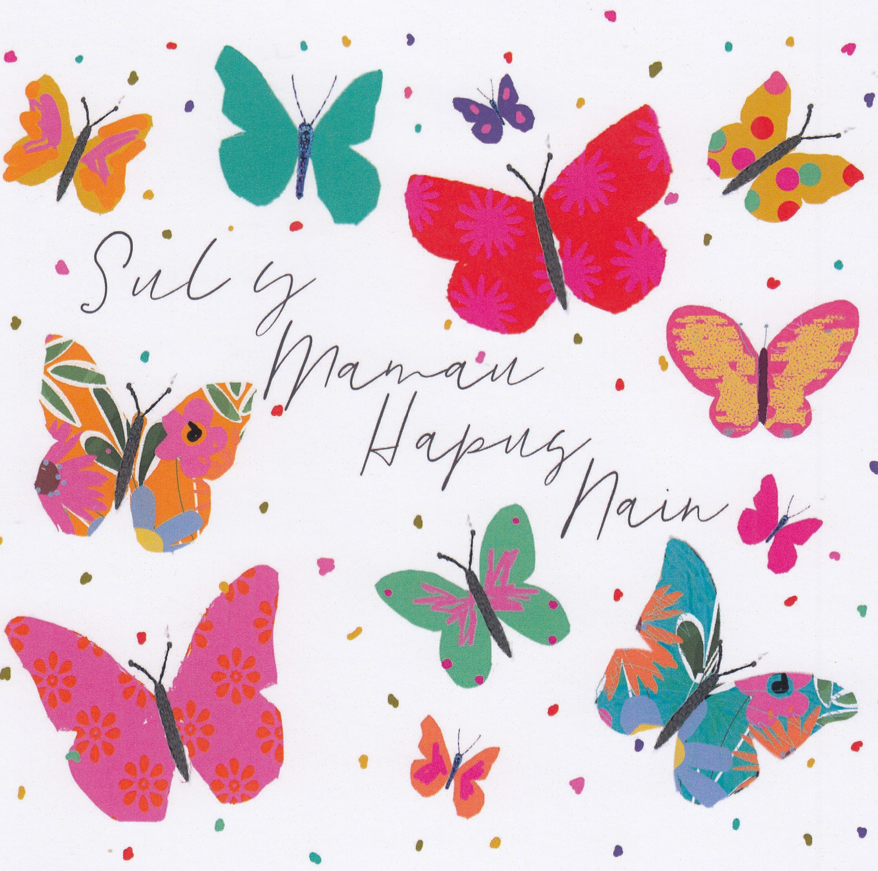 Cerdyn lliwgar ar gyfer anfon eich dymuniadau gorau at eich Nain ar ddiwrnod Sul y Mamau.