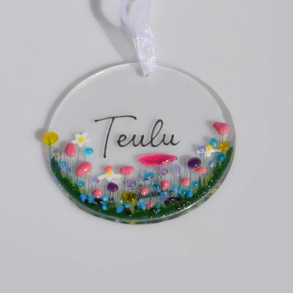 Beautiful handmade wildflower design decorated fused glass 'Teulu' hanging decoration.