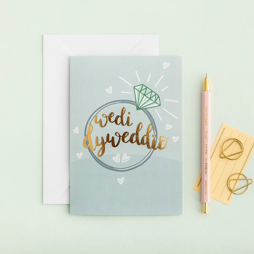 Gorgeous card featuring hand-written text and an original illustration finished in gold foil with the Welsh words 'Wedi dyweddïo' which translates as 'Engaged'.
