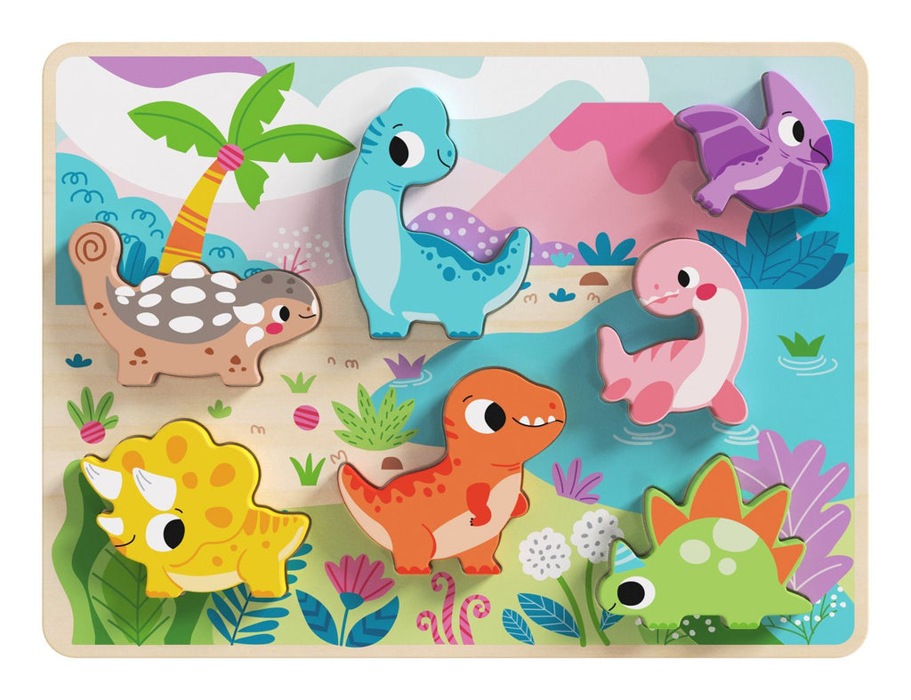 Discover the world of dinosaurs with this wooden dinosaur chunky puzzle! This 8 piece puzzle board has a variety of play patterns as not only is it a puzzle, but the dinosaurs are chunky enough to let children explore the wilderness with the dinosaurs individually and collectively! Each dinosaur piece slots into their place on the board and are ideal for little hands!