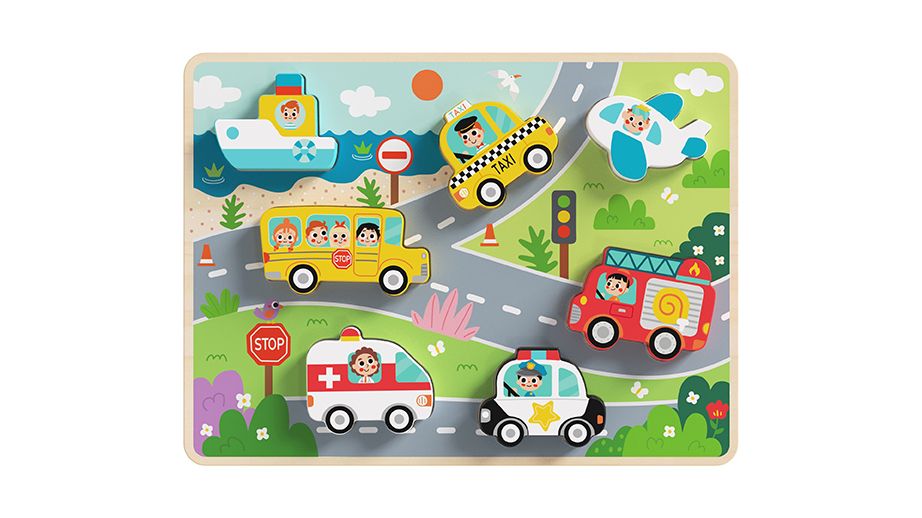 7-piece wooden puzzle with ""transportation" theme Thick puzzle pieces that are easy for small hands to grasp. 2 ways to play: Place pieces in the puzzle board or stand them up for pretend play. Promotes fine motor skills, hand-eye coordination, matching, and problem solving.